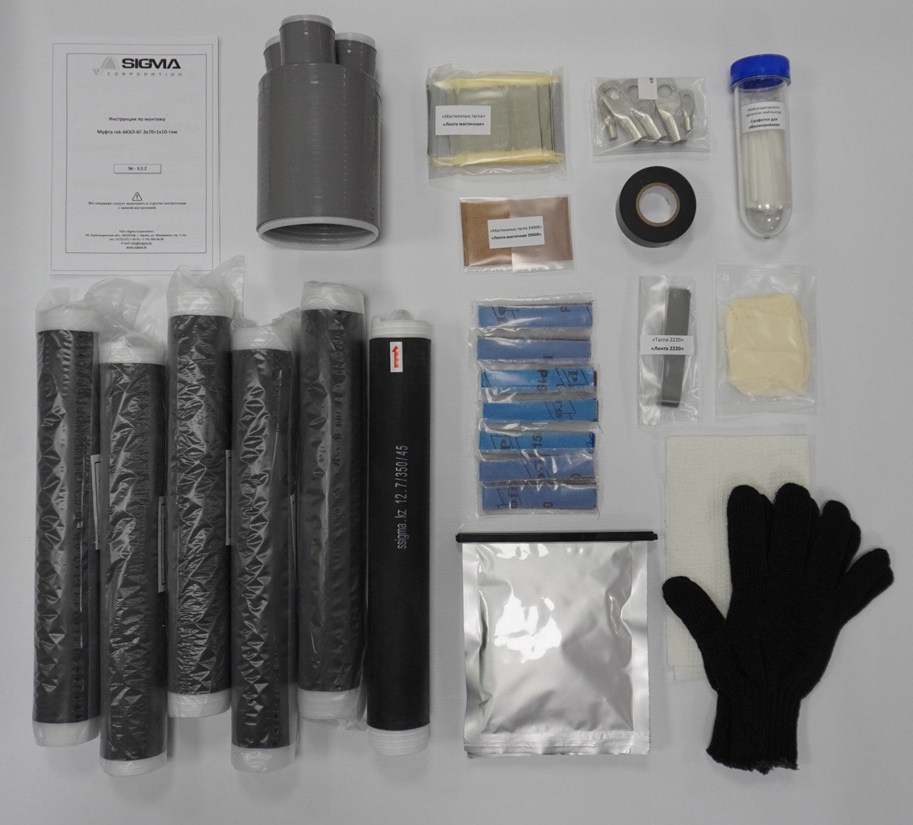 Муфта концевая с безогневой технологией монтажа rek-6КХЛ-КГ применяется для гибких кабелей с резиновой изоляцией, на напряжение 6 кВ. Выравнивание напряжённости электрического поля на срезах полупроводящего слоя жил кабеля производится специальной лентой 2220 с высокой диэлектрической проницаемостью. На каждую основную жилу устанавливаются по две трубки холодной усадки (ТХУ) длиной 350 мм каждая. Корешок кабеля заполняется полиуретановым компаундом 40G методом заливки в предварительно усаженную перчатку холодной усадки (ПХУ).